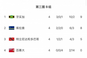 在B组第4轮较量中,此前领跑该小组的库拉索1-1战平特立尼达和多巴哥,牙买加则4-0大胜百慕大。本轮结束后,牙买加9分登顶,库拉索8分第二,特立尼达和多巴哥5分第三,百慕大0分垫底。