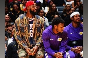 体育资讯10月26日讯 昨日湖人主场迎战森林狼,詹姆斯身穿小儿子布莱斯在亚利桑那大学的球衣到场观赛。