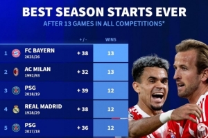 体育资讯10月27日讯 拜仁在本轮德甲焦点战3-0完胜门兴,延续了赛季开局全胜战绩,也追平米兰的五大联赛球队单赛季各项赛事开局连胜纪录。《转会市场》也统计了五大联赛球队历史的单赛季各项赛事前13场比赛的胜场情况。