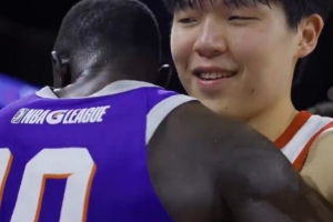赛后,两人相拥致意,杨瀚森还和马卢阿奇简单耳语。