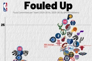 上赛季联盟各队场均犯规数为19.1次;本赛季该数据为22.4次。(数据截至今日赛前)